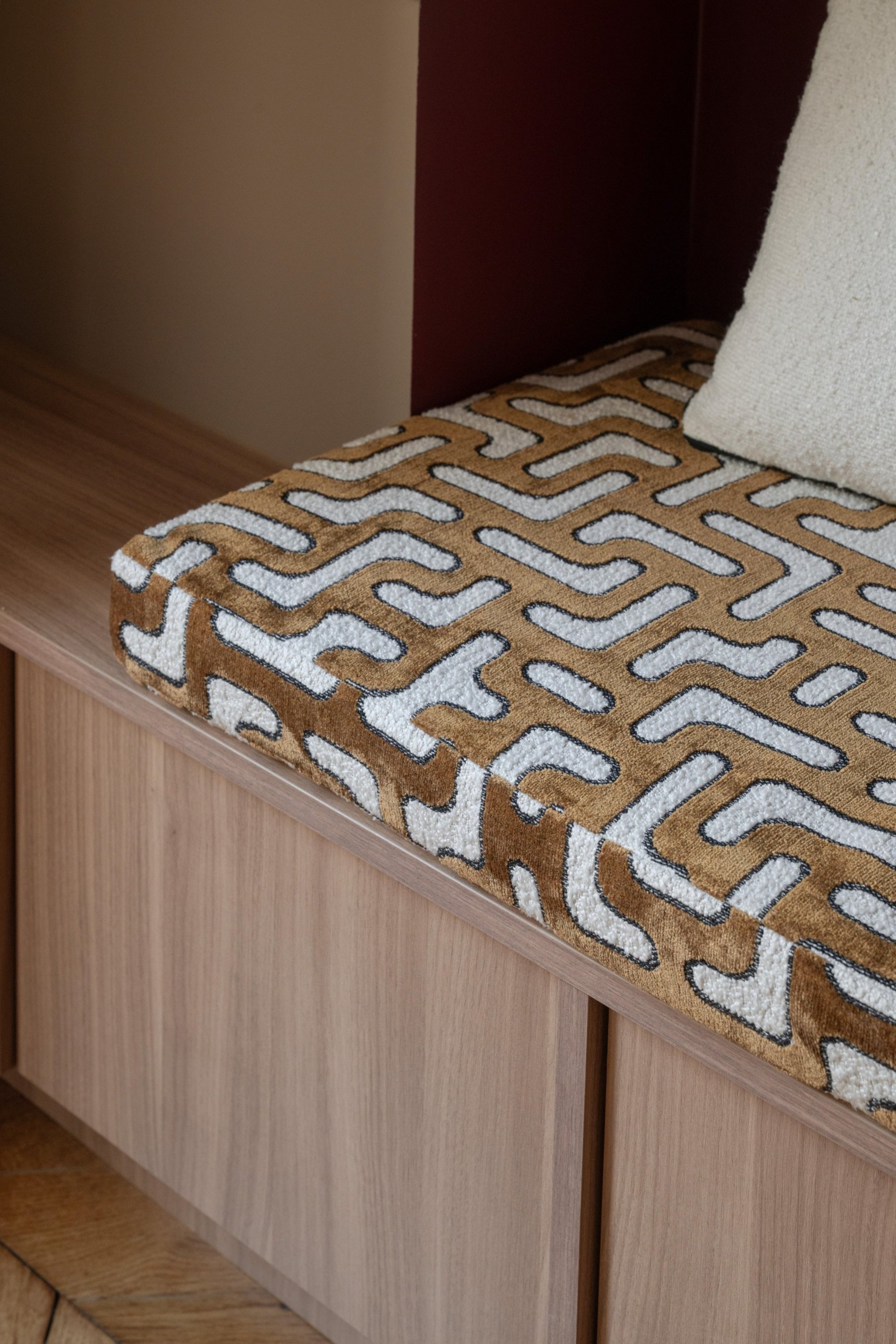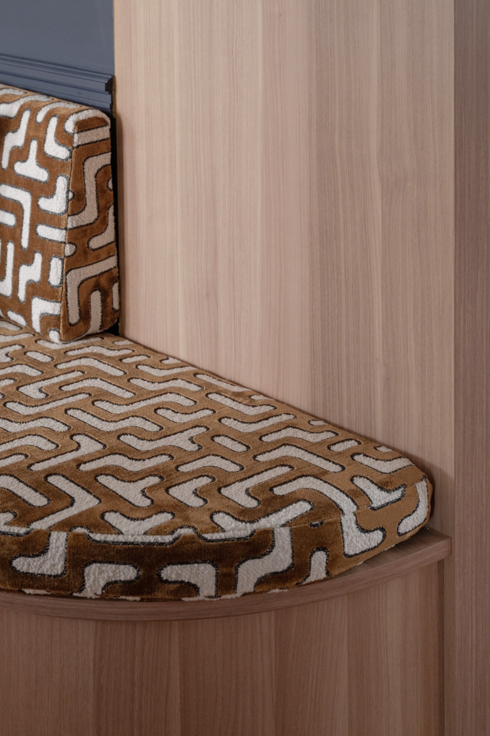Son assise intégrée habillée d'un textile original conjugue confort, élégance et identité visuelle forte dès l'arrivée des visiteurs.