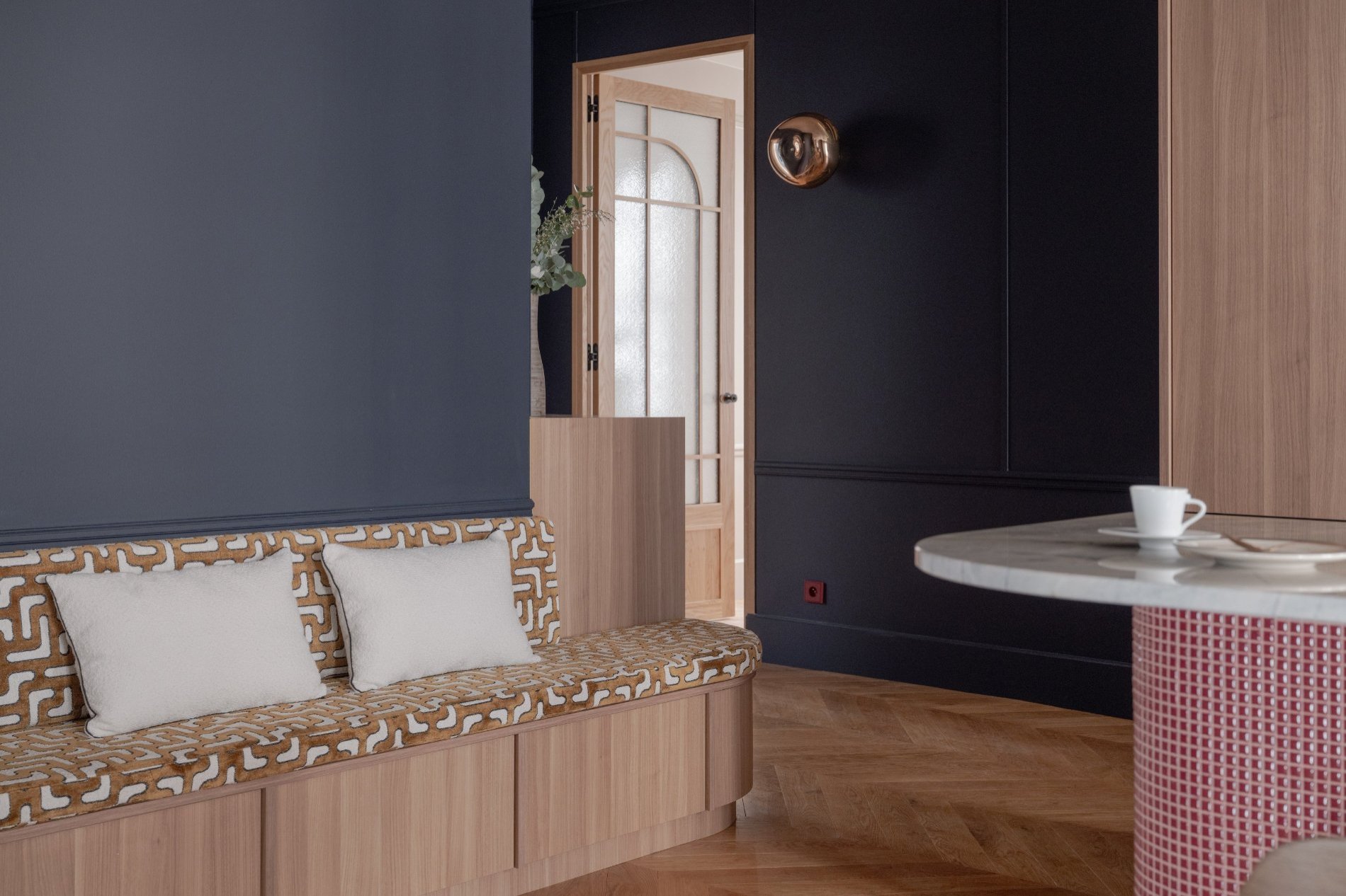 L'élément se distingue par un arrondi doux à l'entrée, qui fluidifie la circulation et apporte une touche contemporaine et accueillant. Cette courbe crée une transition naturelle entre les différents usages du meuble.
