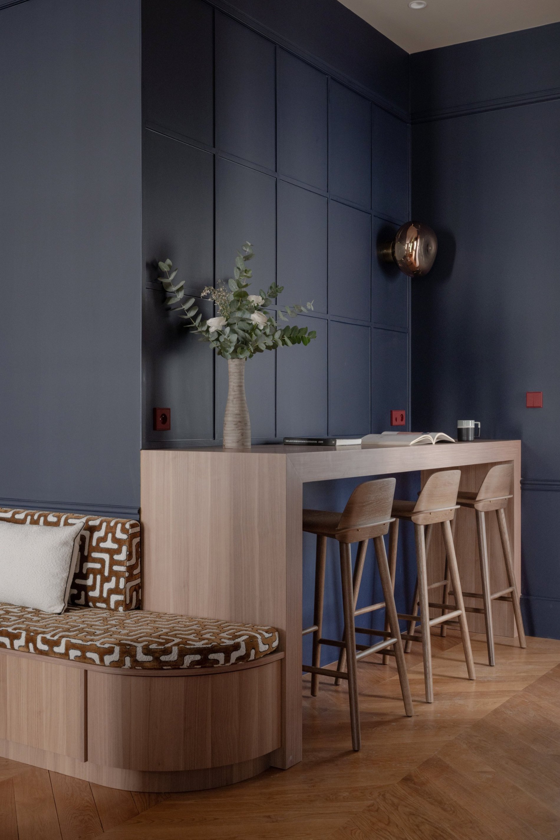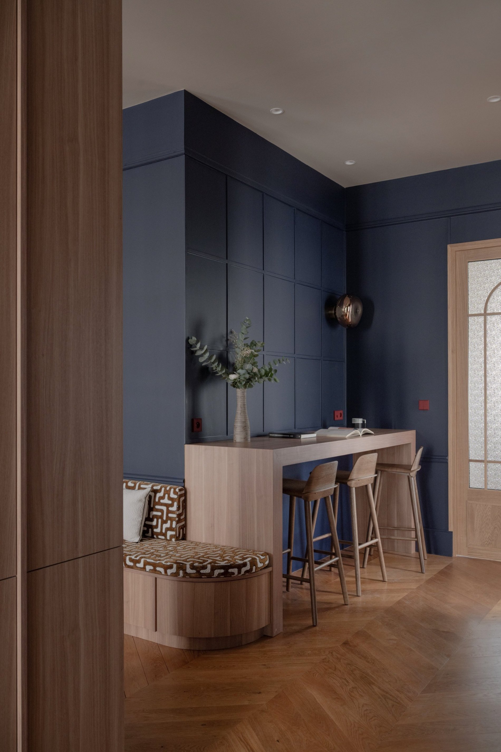 Le meuble se prolonge par un coin repas / télétravail, pensé pour être polyvalent.