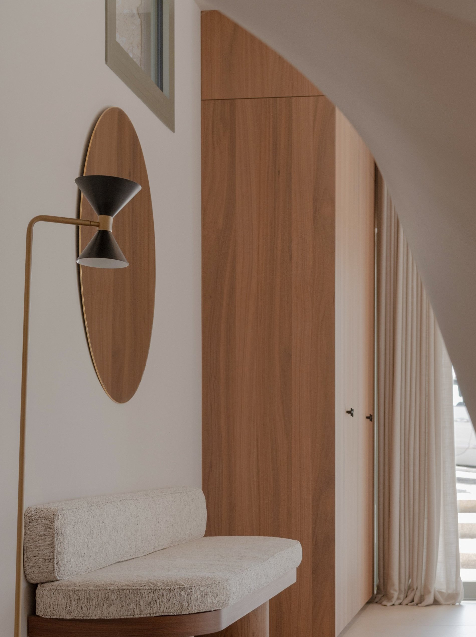 Pensé dans les moindres détails, ce mobilier allie esthétique, praticité et durabilité, et s’intègre harmonieusement à l'architecture de l'entrée, tout en affirmant le caractère sur mesure du projet.