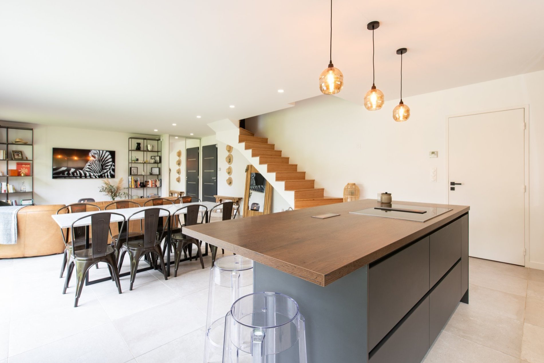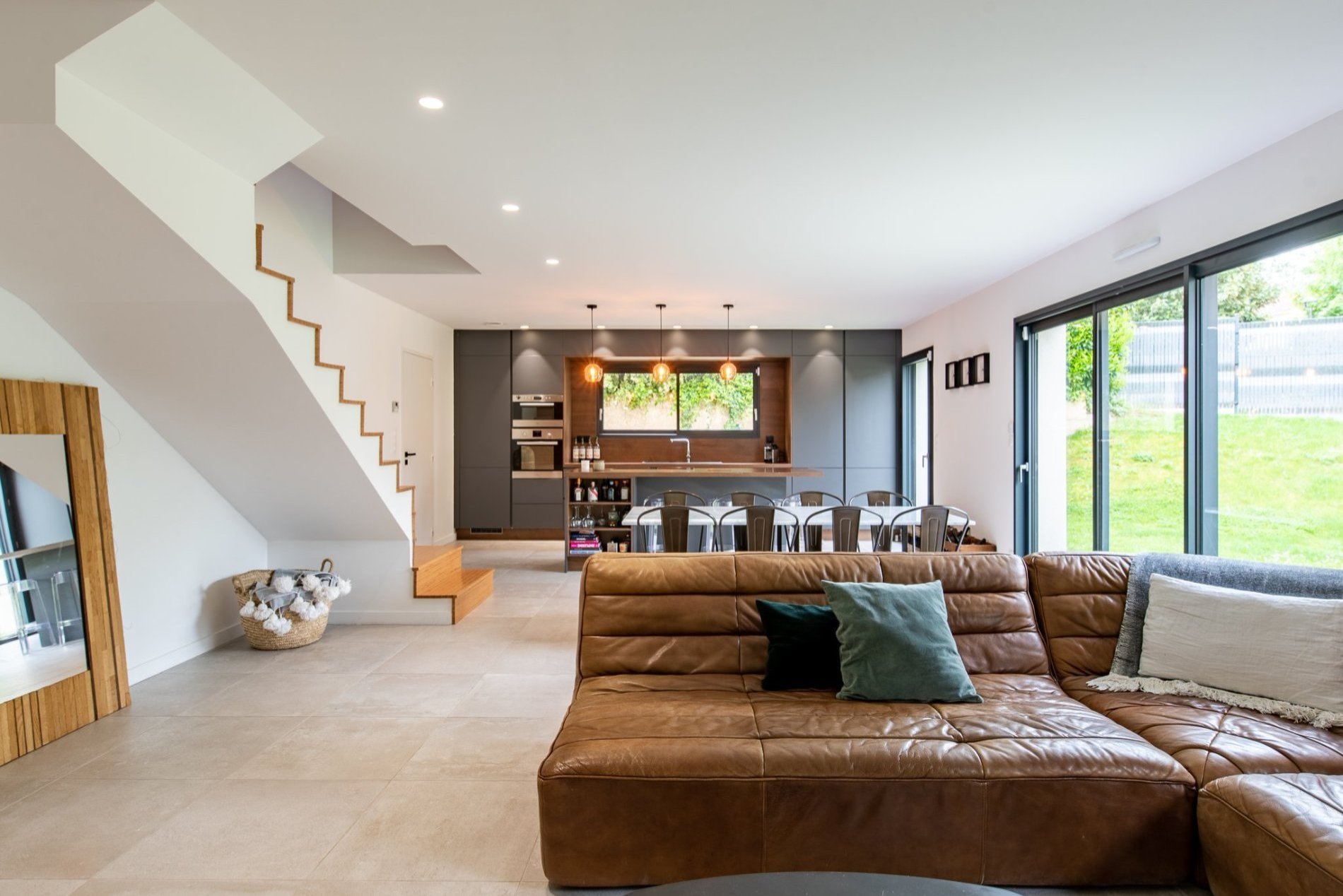 Économique et pratique nous retrouvons régulièrement des escaliers béton dans nos maisons. Il est en revanche utile de le rendre plus esthétique, après décoffrage, la sous face et les côtés sont enduits et peints. Les marches et contremarches, peuvent être habillées de bois . Leurs finesses réduits visuellement l'épaisseur de la structure, mettant ainsi en évidence la ligne brisée de la montée. Ici nos clients ont choisi un lamellé collé Hêtre.